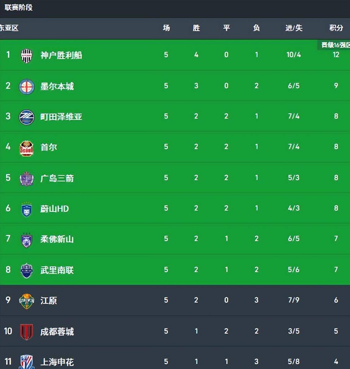 然而,与国内联赛的激烈精彩形成尖锐对比的是,中超球队在亚冠精英赛赛场上的集体低迷。上海海港在亚冠赛中0胜1平4负,仅积1分,在东亚区排名垫底。上海申花的战绩是1胜1平3负,排名倒数第二。成都蓉城则以1胜2平2负的成绩位列倒数第三。具体比分上,海港1比3不敌首尔FC,申花0比2输给神户胜利船,成都1比1战平广岛三箭。