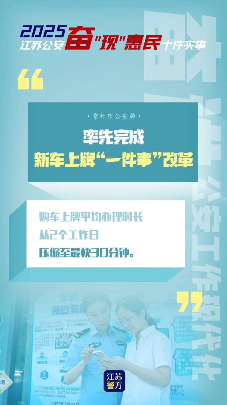 常州公安机关:率先完成新车上牌“一件事”改革。作为全国8个首批试点城市之一,2025年,常州市公安局率先完成新车上牌“一件事”改革,打通政府、企业、社会、金融四类数据壁垒,推出“一键购车、一键投保、一键缴税、一键上牌”全链条线上服务。车主通过“交管12123”APP即可完成购车上牌所有事项,从过去“多部门跑、线下排队”变为“足不出户、全程网办”,年内共办结8684笔业务,平均办理时长从2个工作日压缩至最快30分钟,切实实现便民、利企、提效。