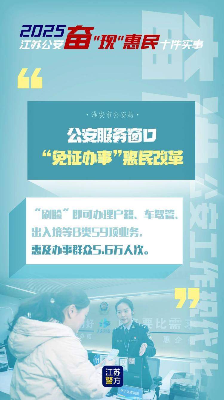 淮安公安机关:公安服务窗口“免证办事”惠民改革。针对群众到窗口办事常因携带证件不齐来回跑、不方便的问题,2025年,淮安市公安局在全省率先全面推广实施“免证办事”,以深化电子证照应用为抓手,打破部门数据壁垒,搭建专门平台,实现在市、县政务服务中心和派出所(车管所)151个综合服务窗口,群众通过“刷脸”即可办理户籍、车驾管、出入境等8类59项业务,群众办事体验全面提升,惠及办事群众5.6万人次。