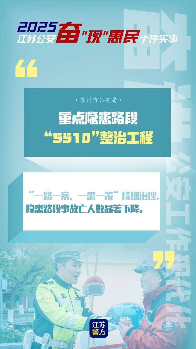 苏州公安机关:重点隐患路段“5510”整治工程。苏州市公安局聚焦近5年、5公里范围内、道路交通事故亡人总数10人左右的重点隐患道路,创新实施道路交通安全重点隐患路段“5510”整治工程,通过“党政主导、公安主推、部门联动、社会参与”形成治理合力,统筹推进隐患治理、违法查处、建章立制等工作,形成标准化隐患治理模式,“一路一案,一患一策”开展精细治理。首批治理的61条道路交通事故亡人数较治理前五年均值下降72.6%;2025年提标升级治理的335处重点隐患路口、路段,交通事故亡人数下降22%。