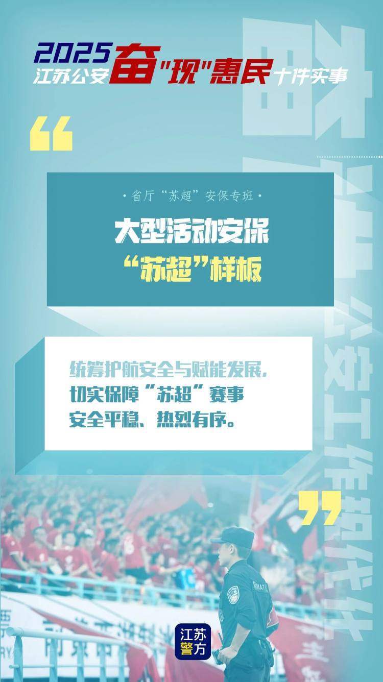 省厅“苏超”安保专班:大型活动安保“苏超”样板。2025年,江苏省城市足球联赛(“苏超”)火爆出圈,面对“苏超”历时近7个月、85场比赛、243万余人次现场观赛的安保压力,江苏公安机关紧紧围绕“安全平稳、热烈有序”总要求,累计投入安保力量18万人次,同时坚持边实战边总结边提升,围绕6个关键环节和重点领域,细化32项安保工作标准,打磨出大型活动安保“苏超”样板,不仅确保赛事安保零失误、安全零事故,更实现了大型活动安保工作从“保安全”向“促治理”、从“守底线”向“创价值”的深刻转变。
