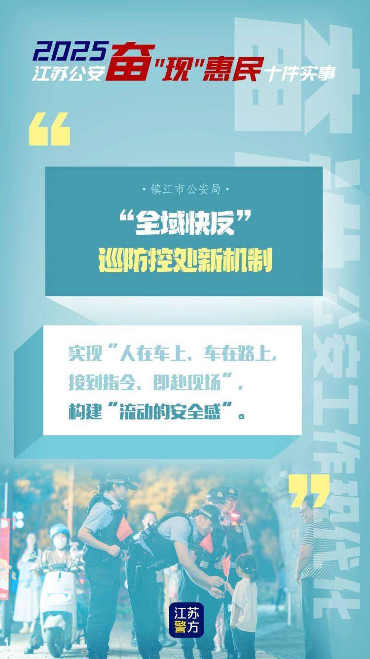 镇江公安机关:“全域快反”巡防控处新机制。聚焦群众对于“更近、更快、更安心”警务工作与高品质安全感的期盼,2025年,镇江市公安局创新实践“全域快反”巡防控处新机制,市域城区划分32个巡区,128名警力以快反车组为“最小作战单位”常态化巡逻,实现“人在车上、车在路上,接到指令、即赴现场”,快反区域内,处警平均到场时间压缩到5分钟左右,让“见警察、见警车、见警灯”成为市民可感可及的“流动安全感”。年内,全市违法犯罪警情同比下降16.41%,真正实现“发案少、秩序好、群众满意”。