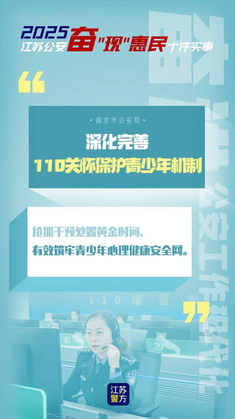 南京公安机关:深化完善110关怀保护青少年机制。针对涉青少年紧急求助警情,2025年,南京市公安局在110报警服务台“心理援助专席”的基础上,升级构建“台上言语疏导、线下快反调度、面上多方协同、多维支撑保障”四位一体新格局,依托各级110报警服务台高效联动心理援助热线,抢抓干预处置“黄金时间”,对涉青少年紧急求助警情做到“即时响应、提级处置、饱和调度”。年内,110报警服务台成功关爱援助青少年1316人次,有效筑牢青少年心理健康安全网,受到社会各界广泛好评。