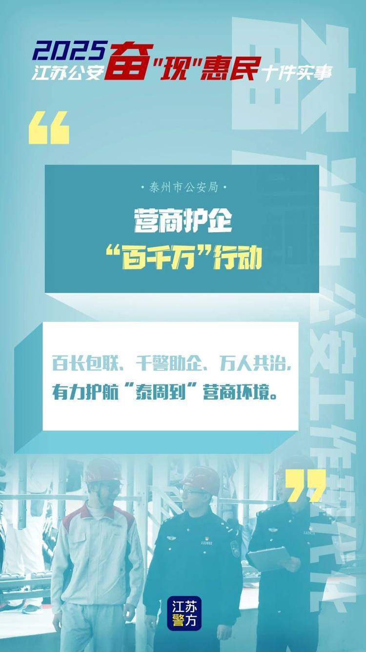 泰州公安机关:营商护企“百千万”行动。2025年,泰州市公安局以“百千万”护航“泰周到”营商环境,推动形成“百长包联、千警助企、万人共治”的公安营商护企工作格局,建设完善“中心+前哨+专员”组织体系,主动为企业提供涵盖市场、金融、外贸、知产、网络、安监等领域的“平安体检”套餐,一体推进诉求解决、权益保障、执法服务、秩序守护“四个周到”,年内,全市19个重点产业园区刑事发案同比压降73.9%,多家头部企业致感谢信。