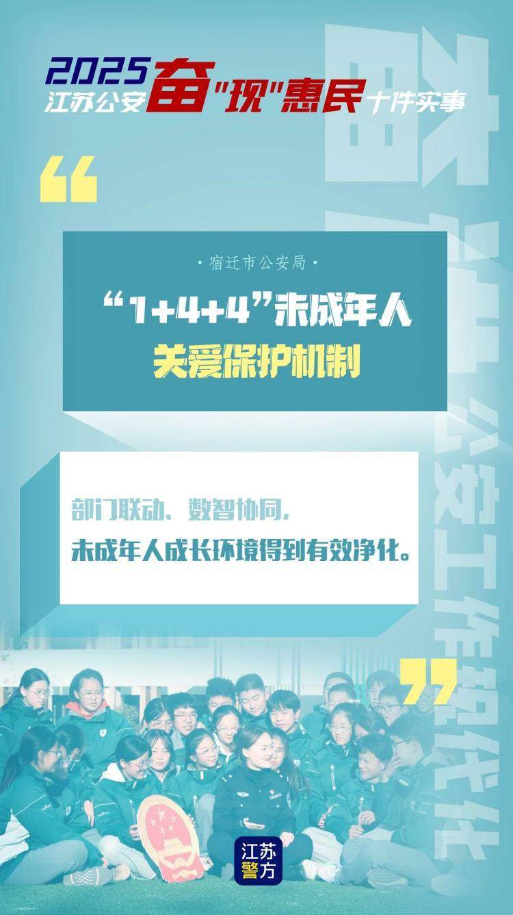 宿迁公安机关:“1+4+4”未成年人关爱保护机制。2025年,宿迁市公安局构建未成年人关爱保护“1+4+4”数智协同机制,即以一个“慧蕾”平台为“智慧大脑”,汇聚多部门数据与资源,合力推动“关爱帮扶、综合干预、协同保护、司法惩治”四项工程,创新开展“数据智治协同、违法犯罪治理、成长环境净化、关爱帮扶联动”四大攻坚,实现风险预警、干预处置、帮扶保护的智能化预警、流程化管理和闭环化运行。2025年,宿迁未成年人违法犯罪呈现明显下降态势。
