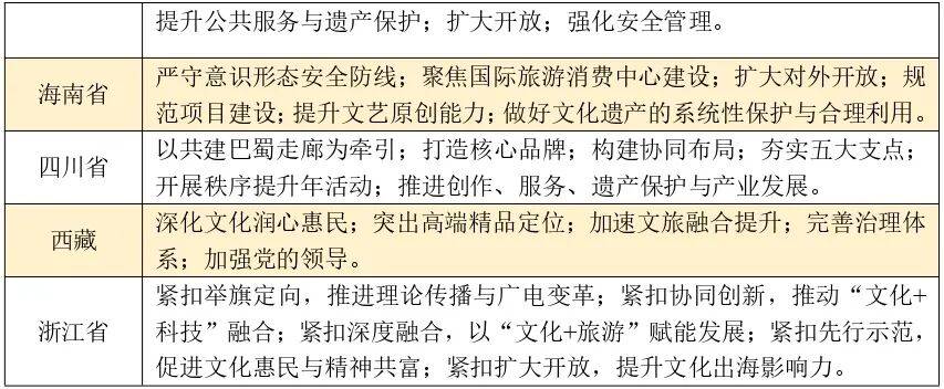 总体而言,各地以中央精神为纲,以融合为手段,以品质为核心,以消费为导向,以安全为底线,以特色为优势,围绕产业融合发展、文旅品牌塑造、文化遗产活化等维度,提出了各具特色的年度实施路径。