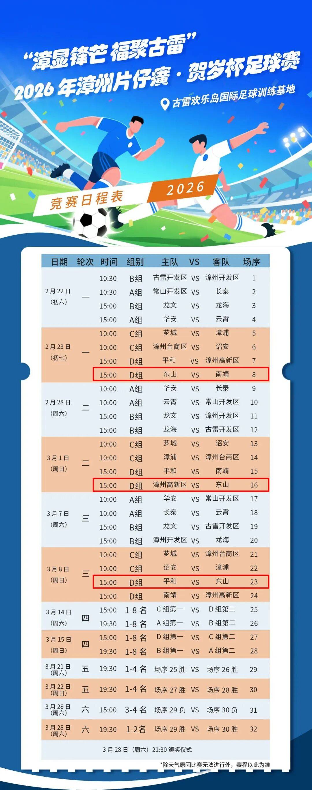 江苏超级足球联赛,江苏足协联赛,足球赛程,积分榜,江苏球队,足球直播,聚焦江苏超级足球联赛,提供2025年赛程、积分榜、参赛队伍资料、赛事直播及精华集锦,全民足球激情不断更新!2月22日(正月初六)上午,“漳显锋芒 福聚古雷”2026年漳州片仔癀·贺岁杯足球赛在欢乐岛国际足球训练基地燃情开赛。本次赛事将持续至3月28日,横跨春节与元宵。赛事以体育为纽带,融合足球竞技、新春年味、闽南文化与文旅体验,同步推出“票根增值计划”,贯通吃住游购娱全链条,将球场资源转化为惠民实效,为新年注入体育活力。